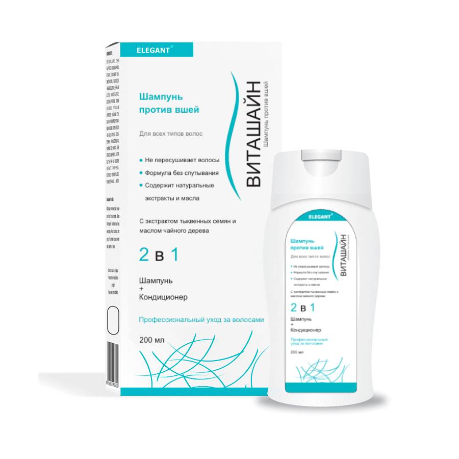 Шампунь против вшей ВИТАШАЙН обогащен активными веществами, обладающими естественными свойствами в борьбе против вшей, что позволяет уменьшить их количество. Экстракт семян тыквы, экстракт нима и экстракт пажитника обладают свойствами устранять вшей. Камфорное масло, касторовое масло и масло чайного дерева придают волосам длительное увлажнение и блеск.